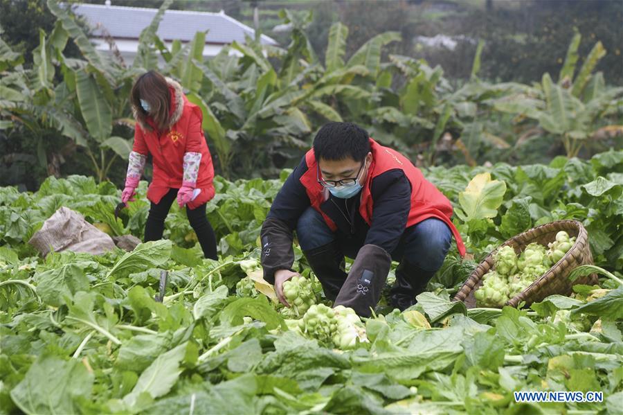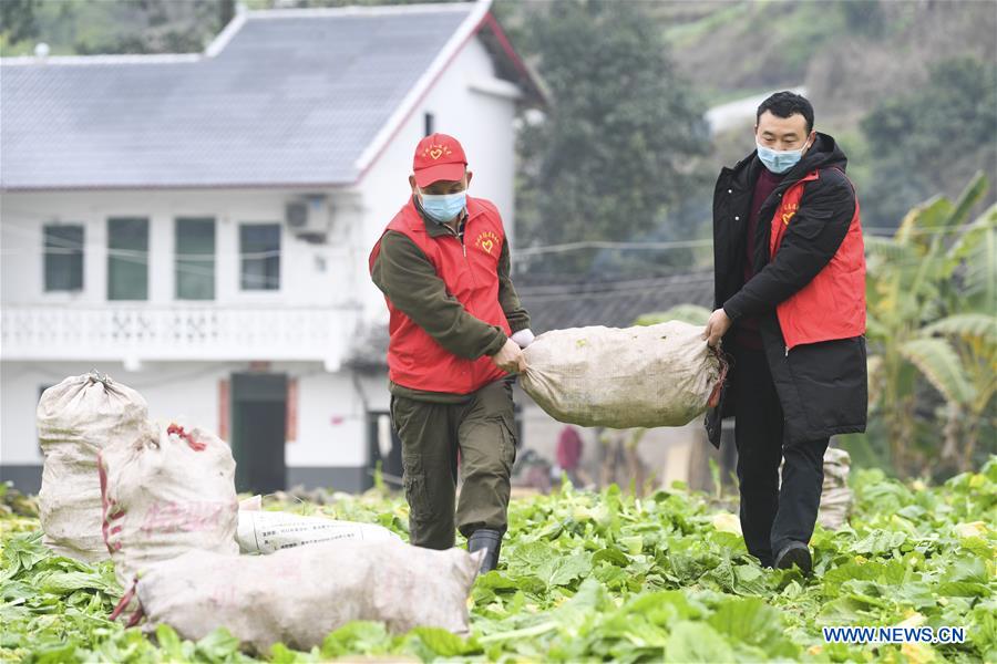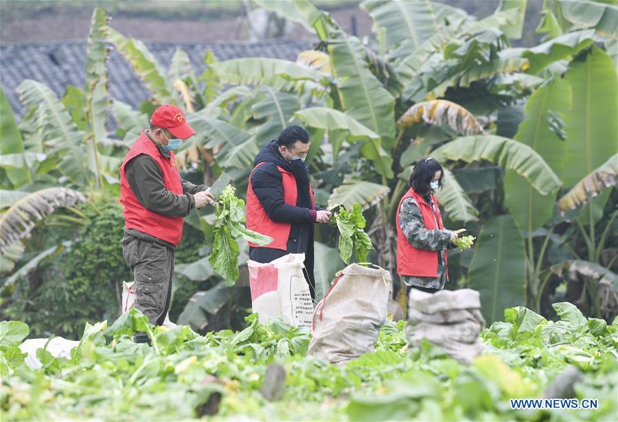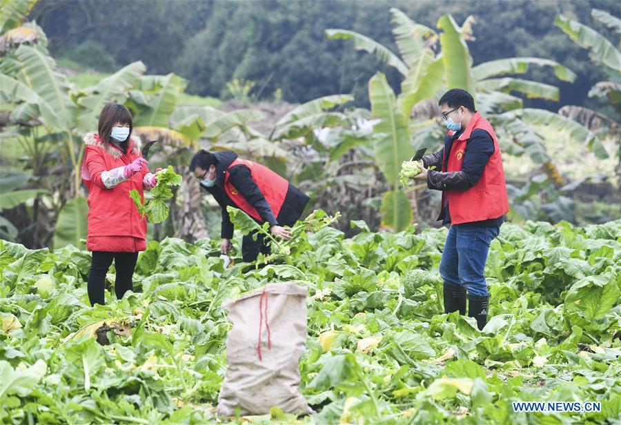 Volunteers harvest stem mustard for villagers at Erdu Village in Fuling District, southwest China's Chongqing Municipality, February 13, 2020. A volunteer service group has been formed in Fuling District of Chongqing Municipality to help locals in need and those who are in quarantine at home to harvest stem mustard, the raw material for the pickle, amid the fight against novel coronavirus outbreak. [Xinhua/Wang Quanchao]